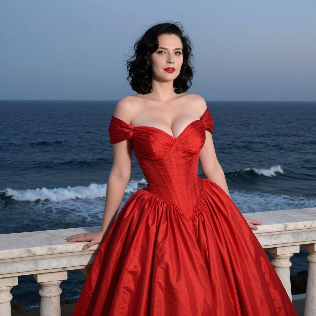 A woman poses elegantly on a seaside terrace wearing a vibrant off-shoulder red gown with a fitted bodice and full skirt. The backdrop of the ocean and subtle waves complements the classic and glamorous style of her dress and makeup.