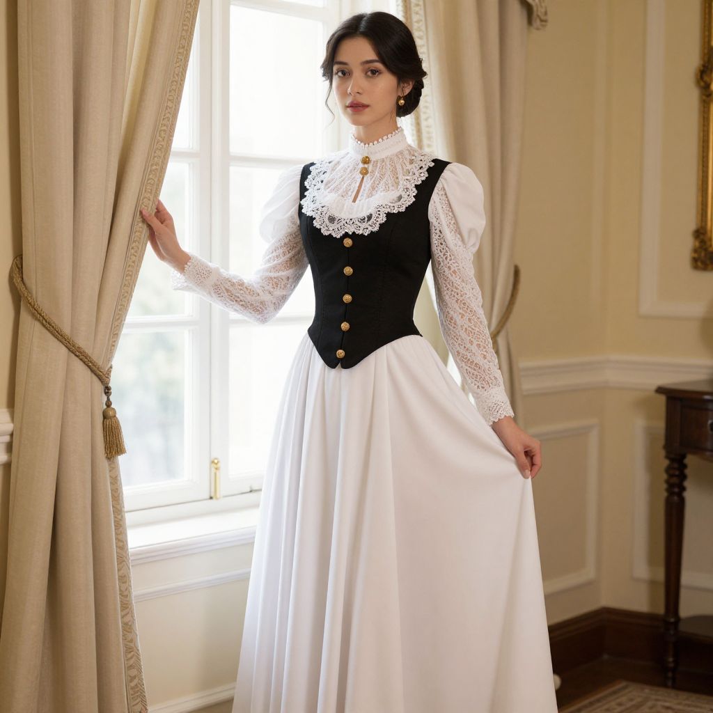 A woman stands elegantly by a window in a vintage-inspired outfit featuring a black corset over a long white dress with lace sleeves and a ruffled high collar. The soft natural light and classic interior setting enhance the Victorian-era fashion aesthetic. The overall composition exudes timeless grace and refined sophistication.