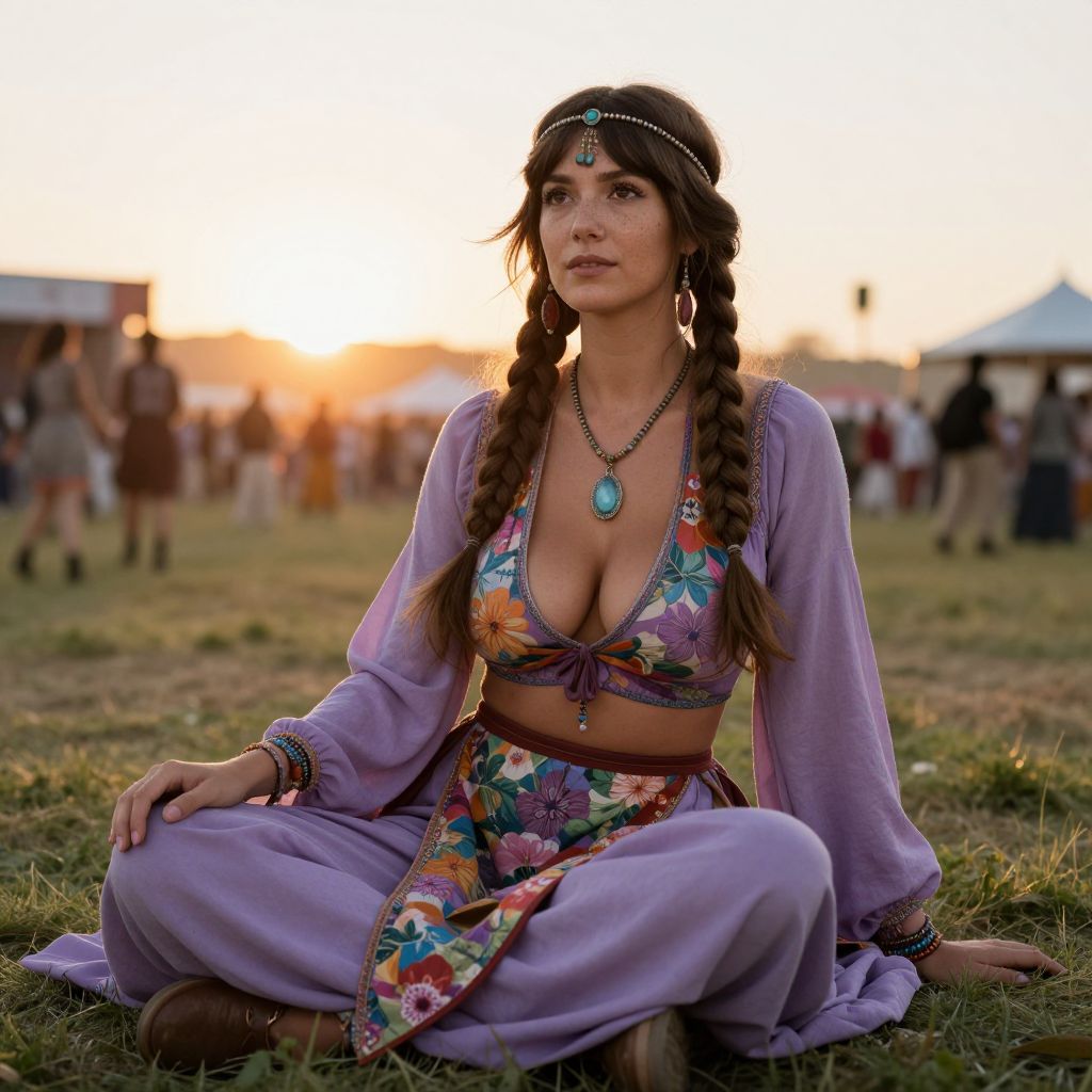 A young woman dressed in vibrant bohemian attire sits cross-legged on the grass at an outdoor festival during sunset. She wears a floral-patterned top and skirt paired with a lavender outer garment, adorned with turquoise jewelry and braided hair, embodying a free-spirited, hippie style in a serene natural setting.