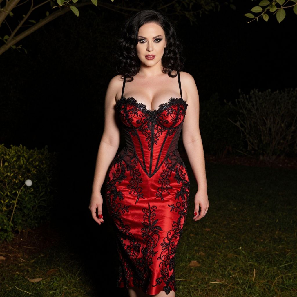 A confident woman poses outdoors at night wearing a striking red satin dress adorned with intricate black lace detailing. Her hairstyle and makeup emphasize a glamorous, vintage-inspired look that complements the elegant and fitted silhouette of the dress.