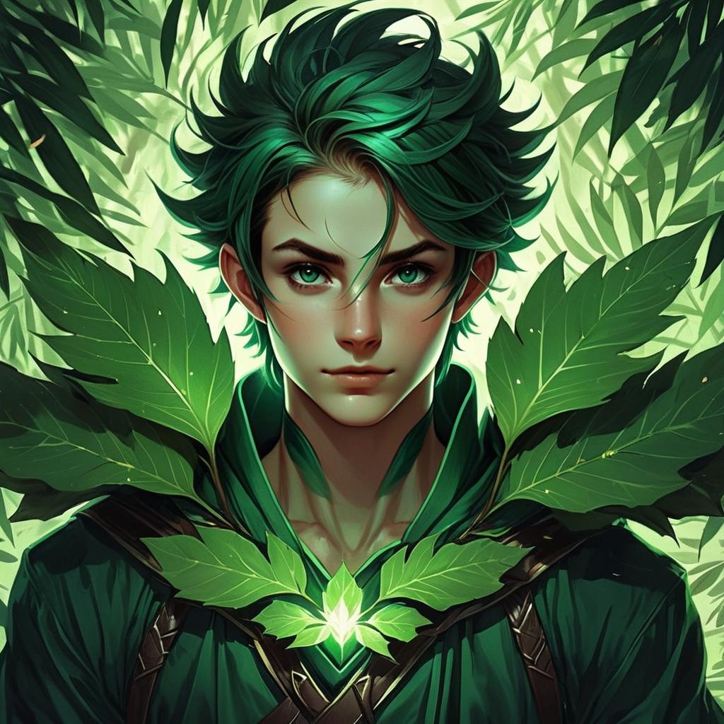 This vibrant digital portrait features a young man with striking green hair and intense emerald eyes, surrounded by lush green leaves that blend seamlessly with his attire. The artwork is highly detailed with a fantasy style, capturing an ethereal and nature-inspired atmosphere.