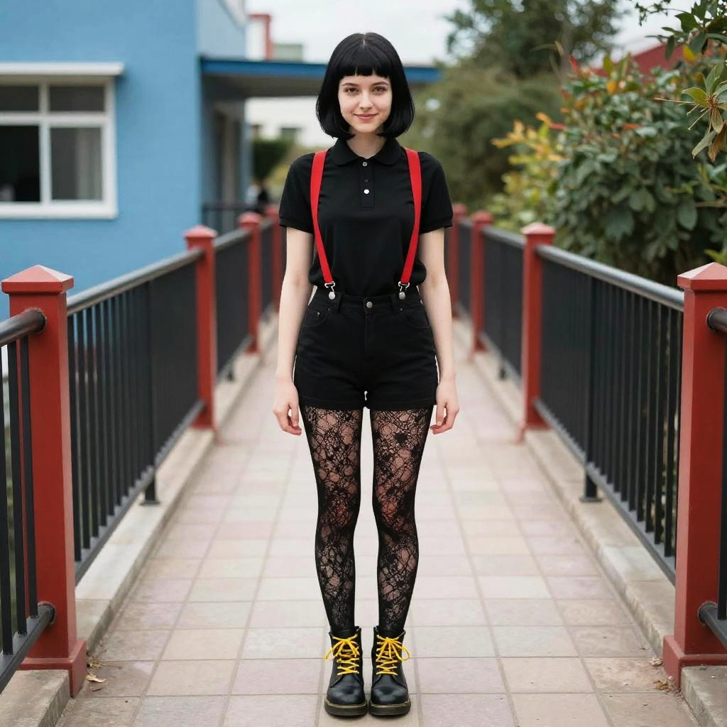 A young woman stands confidently on a tiled pathway flanked by black and red railings, dressed in a black polo shirt, high-waisted shorts, and lace-patterned tights. Her outfit is accented with bold red suspenders and black combat boots with yellow laces, complemented by her short black bob haircut and minimal makeup, evoking a modern alternative or indie fashion style.