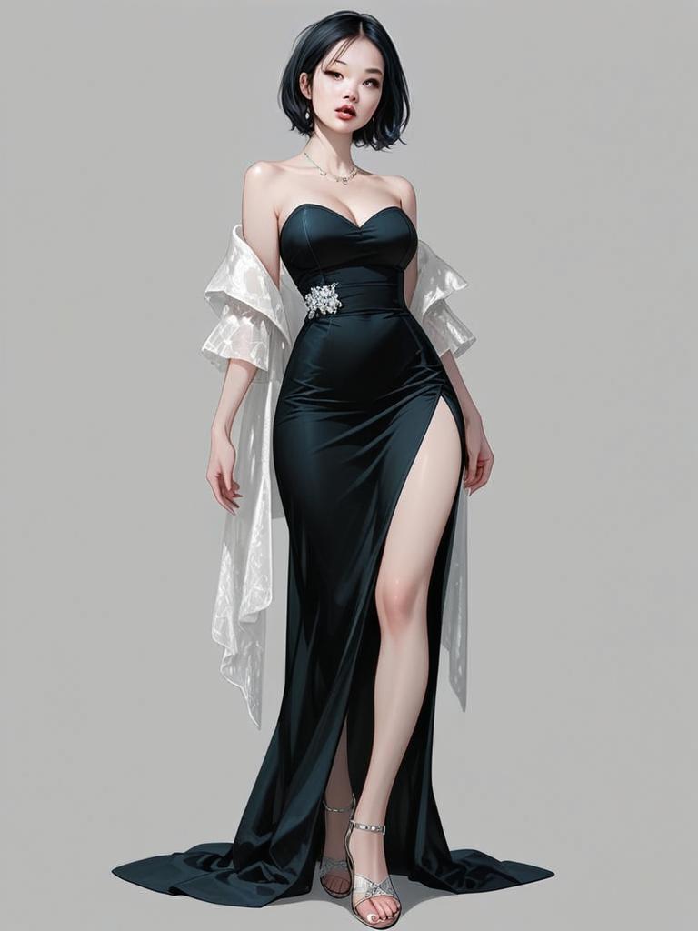 A striking digital artwork of a woman in a sophisticated, strapless black evening gown with a high thigh slit, complemented by a sheer white shawl draped over her shoulders. The realistic style emphasizes smooth textures and refined details, highlighting contemporary elegance and fashion.