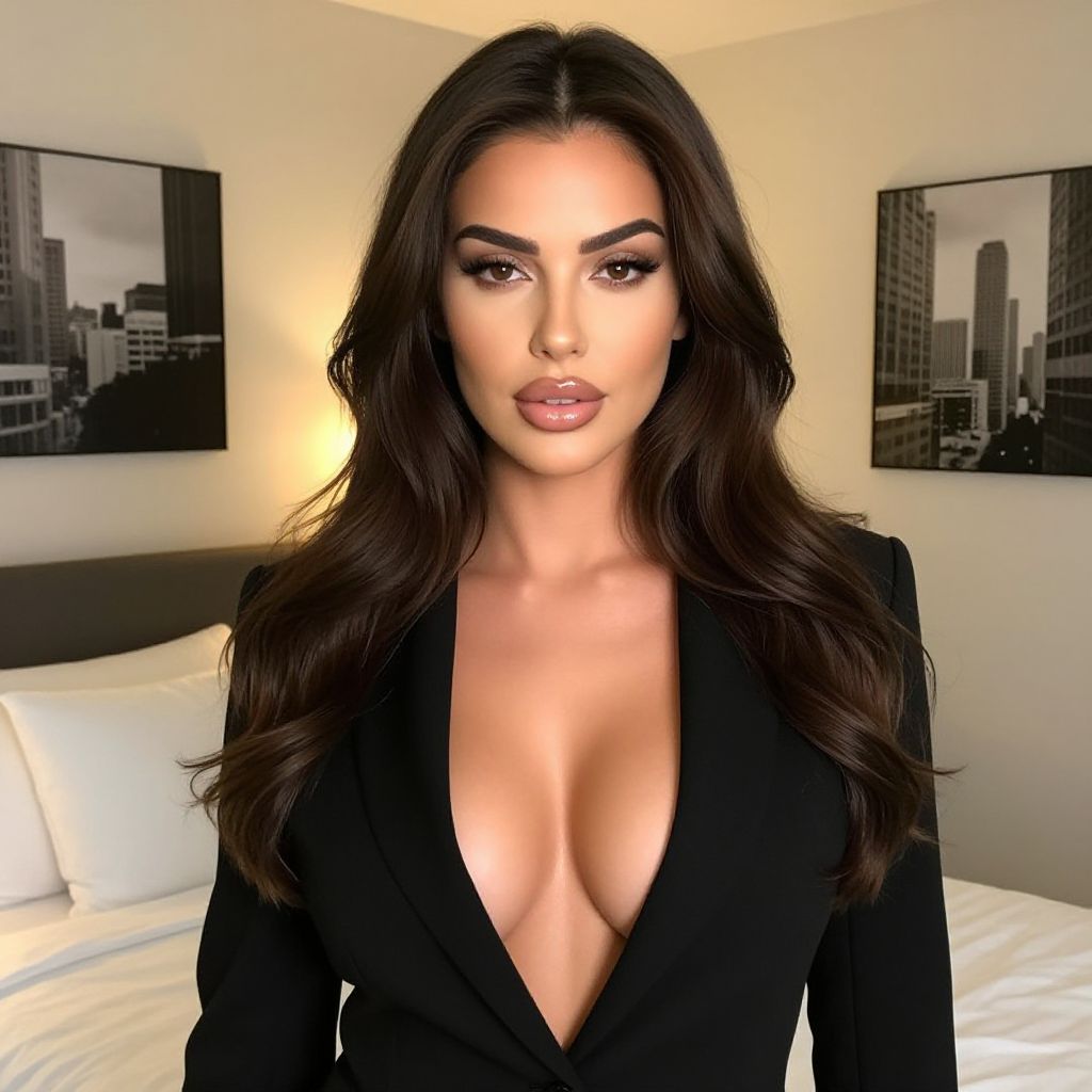 A confident woman with long, wavy dark hair poses indoors wearing a black blazer with a deep neckline, exuding elegance and sophistication. The background features a cozy bedroom setting with cityscape wall art, complementing the modern, chic ambiance of the portrait.