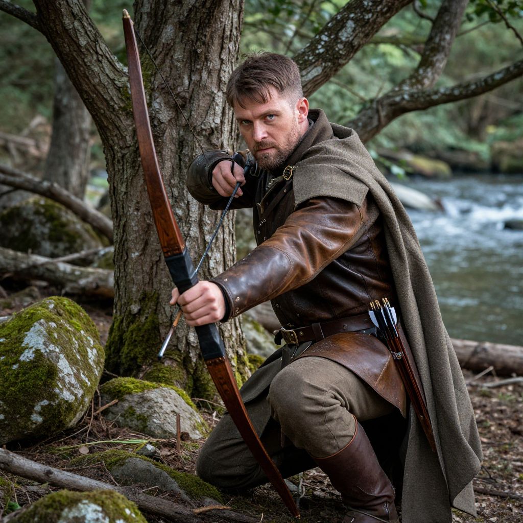 A focused man dressed in medieval-inspired attire kneels in a forest setting by a river, aiming a wooden longbow with an arrow ready to shoot. His rugged leather jacket and cloak add to the historical archery theme set against a natural, moss-covered woodland backdrop.