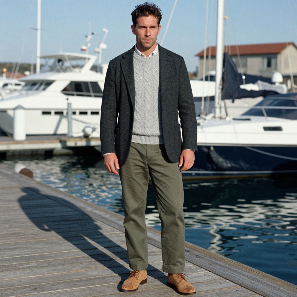 A man dressed in a smart-casual outfit stands confidently on a marina dock with yachts in the background. He wears a dark blazer over a light gray cable-knit sweater, paired with olive green pants and tan suede shoes, embodying a refined coastal style.