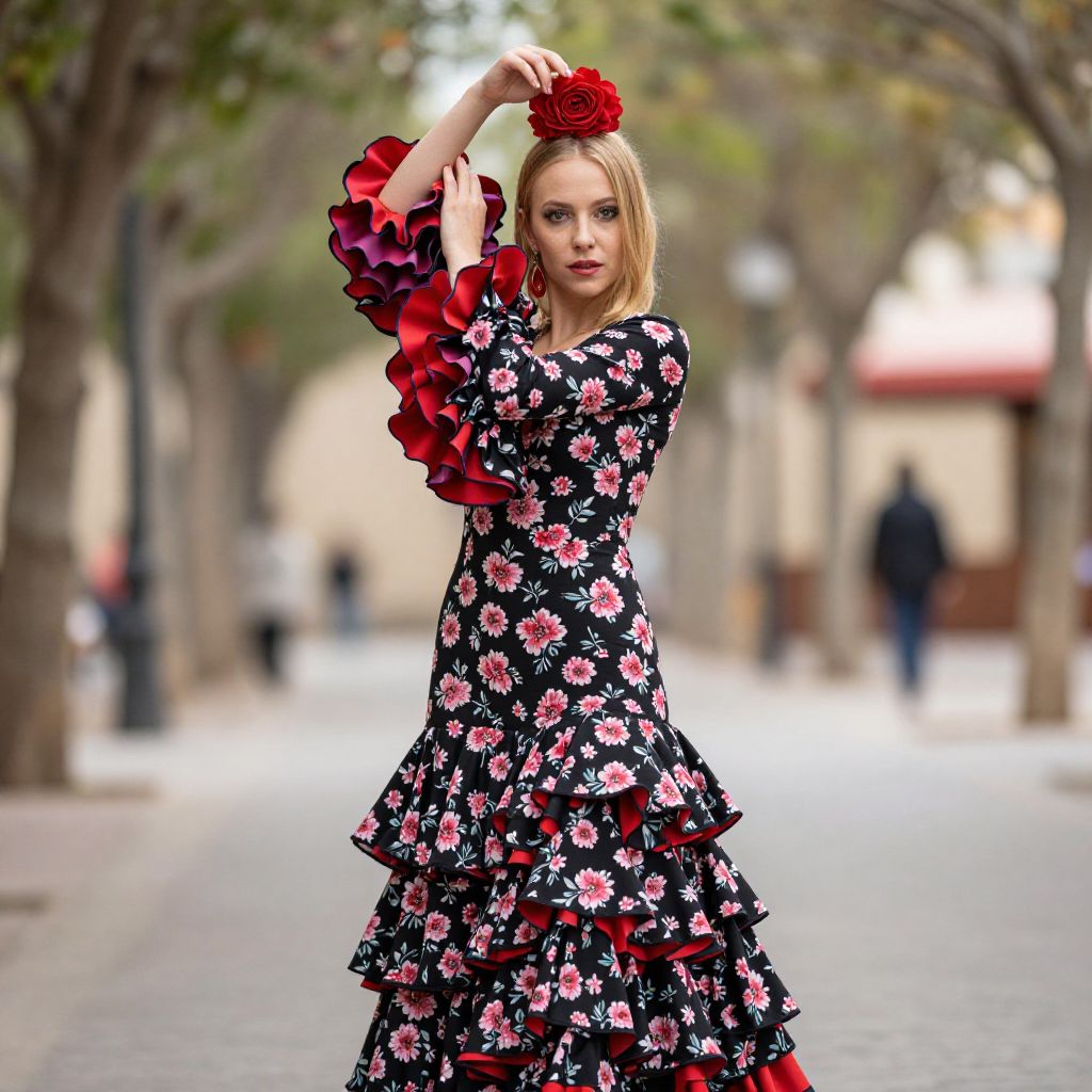 A woman dressed in a traditional black flamenco dress adorned with pink floral patterns and vibrant red ruffles poses gracefully on a tree-lined street. She holds a red rose above her head, embodying the spirit and elegance of flamenco dance culture.