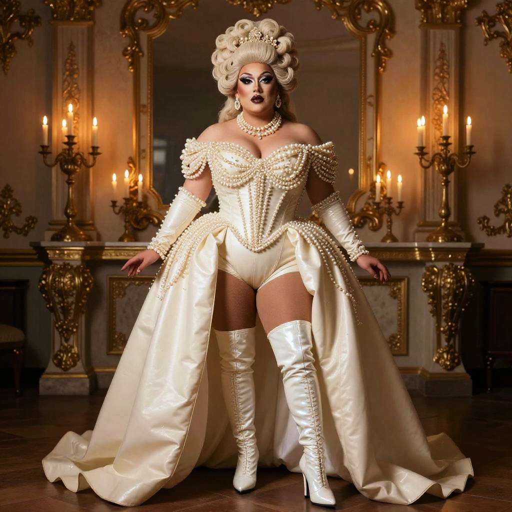 Glamorous Drag Queen in Elaborate Pearl Corset and Rococo Setting