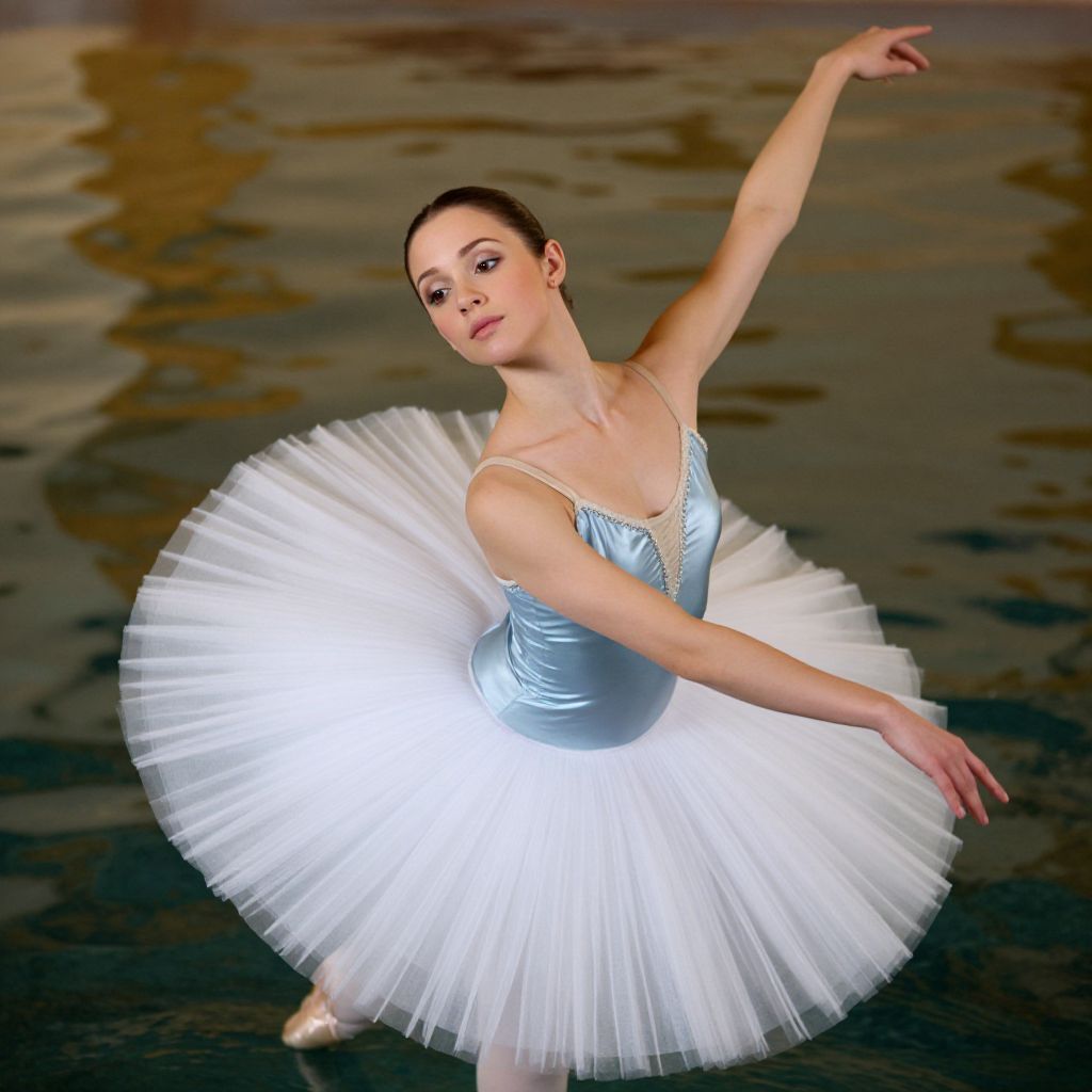 A graceful ballerina dressed in a light blue satin bodice and classic white tutu performs an elegant dance pose. Her arms are gracefully extended while her focus remains soft and poised against a muted, reflective background.