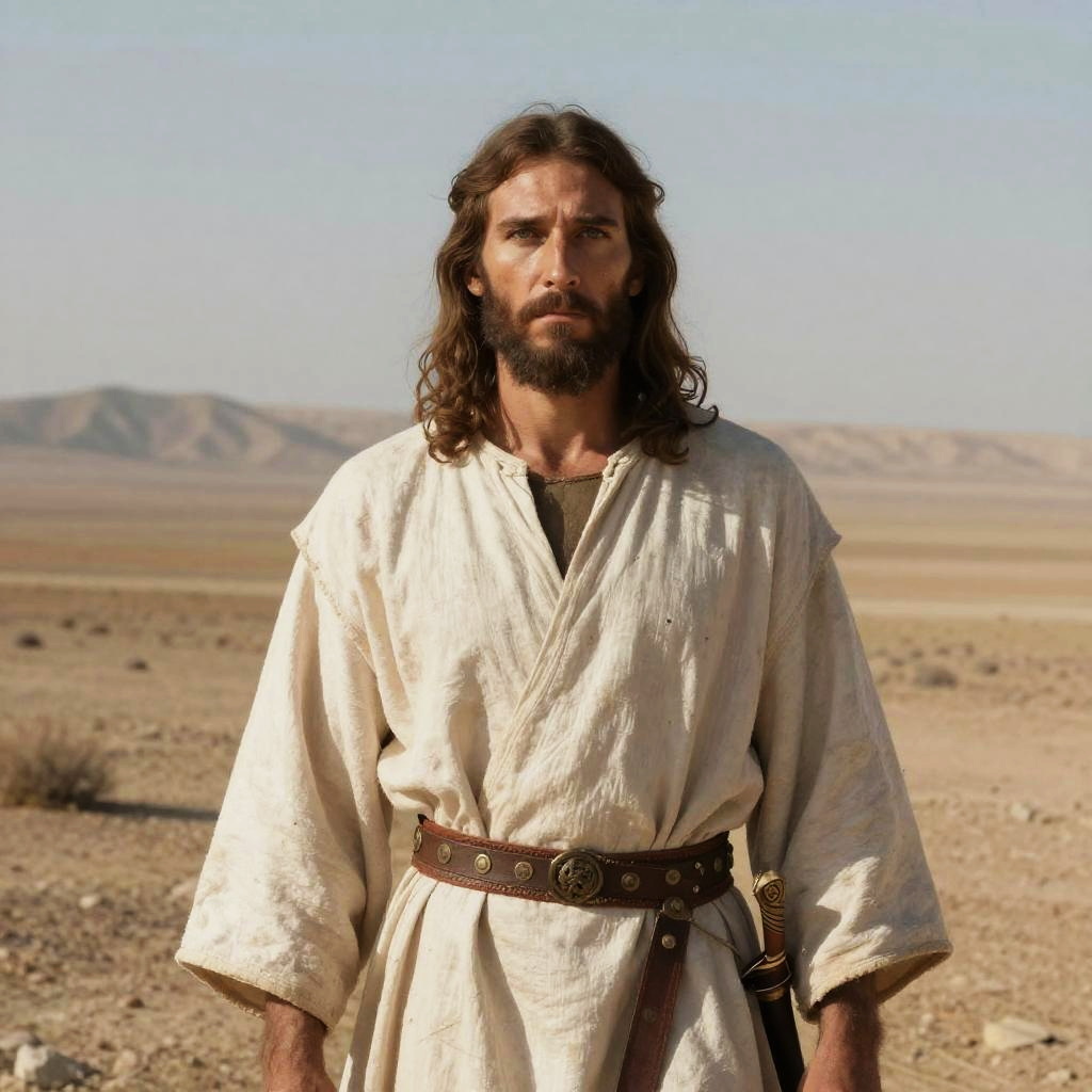 A man with long hair and a beard stands solemnly in a vast desert landscape, wearing a traditional loose white robe cinched with a wide leather belt adorned with metal studs and a sheath. The scene evokes a historical or biblical atmosphere, emphasizing a rugged and timeless look against a muted, natural background.