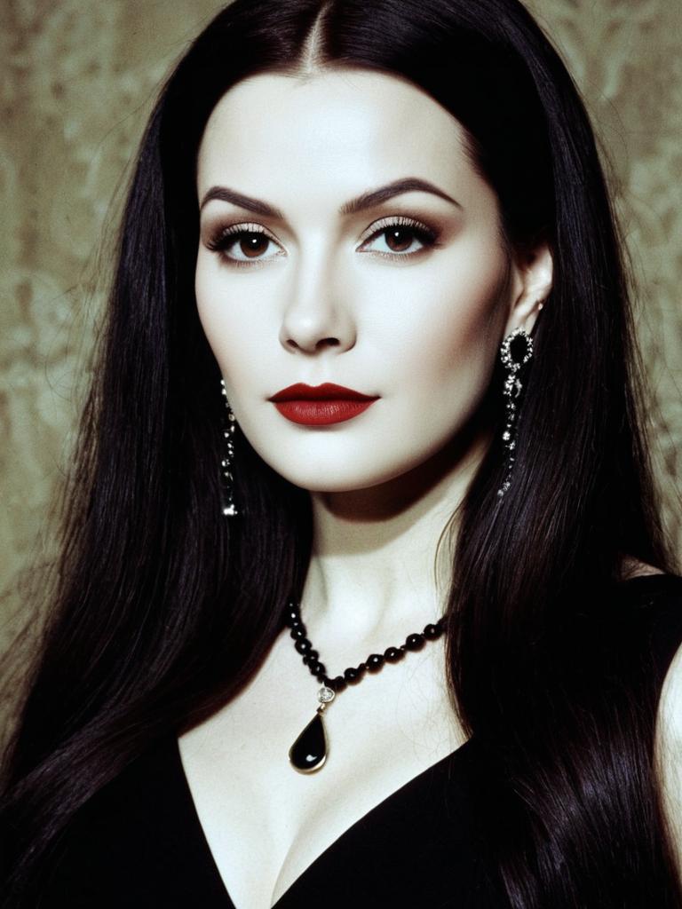 A striking portrait of a woman styled in a Morticia Addams-inspired outfit, featuring long, sleek black hair, dramatic makeup with bold red lipstick, and elegant black jewelry including teardrop earrings and a matching necklace. The image captures a glamorous, gothic aesthetic with a realistic photographic style.