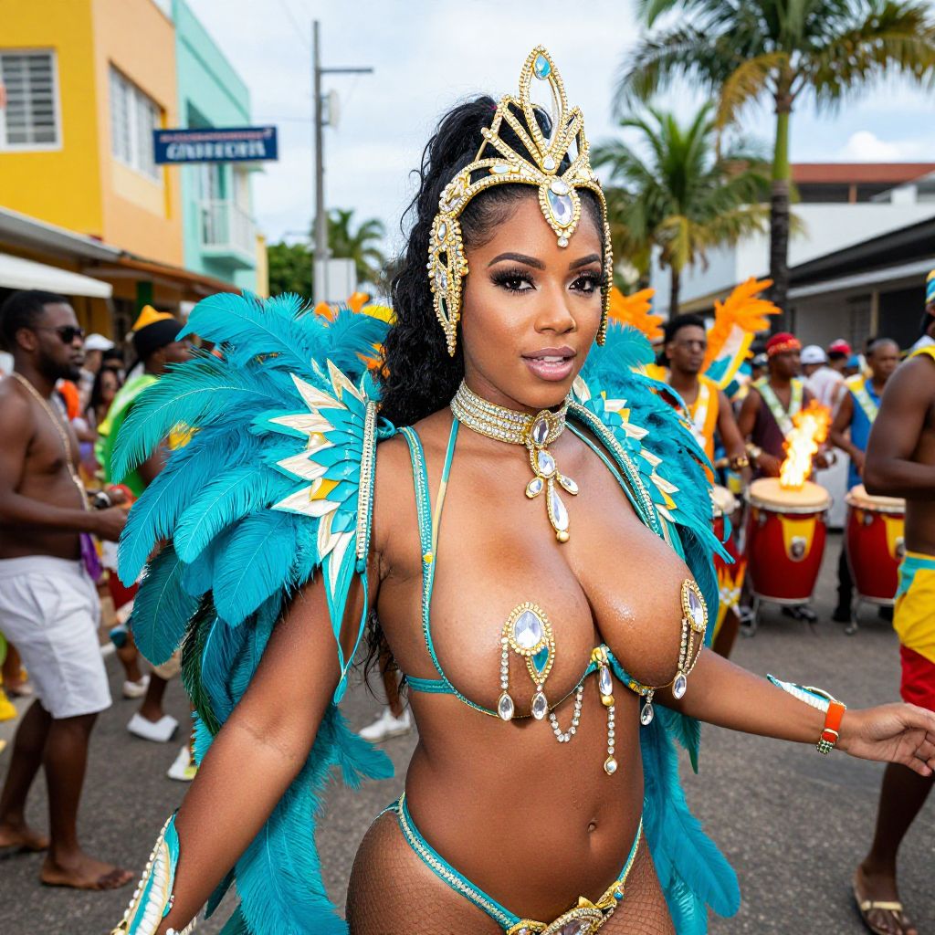 A woman dressed in an elaborate turquoise and gold carnival costume adorned with large feathers and sparkling jewels enjoys a vibrant street parade. The festive atmosphere is highlighted by drummers and colorful buildings in the background, capturing the lively spirit of a cultural carnival celebration.