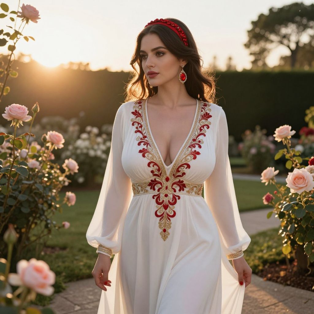 A woman stands gracefully in a garden filled with blooming pink roses during golden hour sunlight. She wears an elegant white dress with intricate red and gold embroidery, complemented by matching red earrings and a headband, exuding a vintage-inspired romantic style.