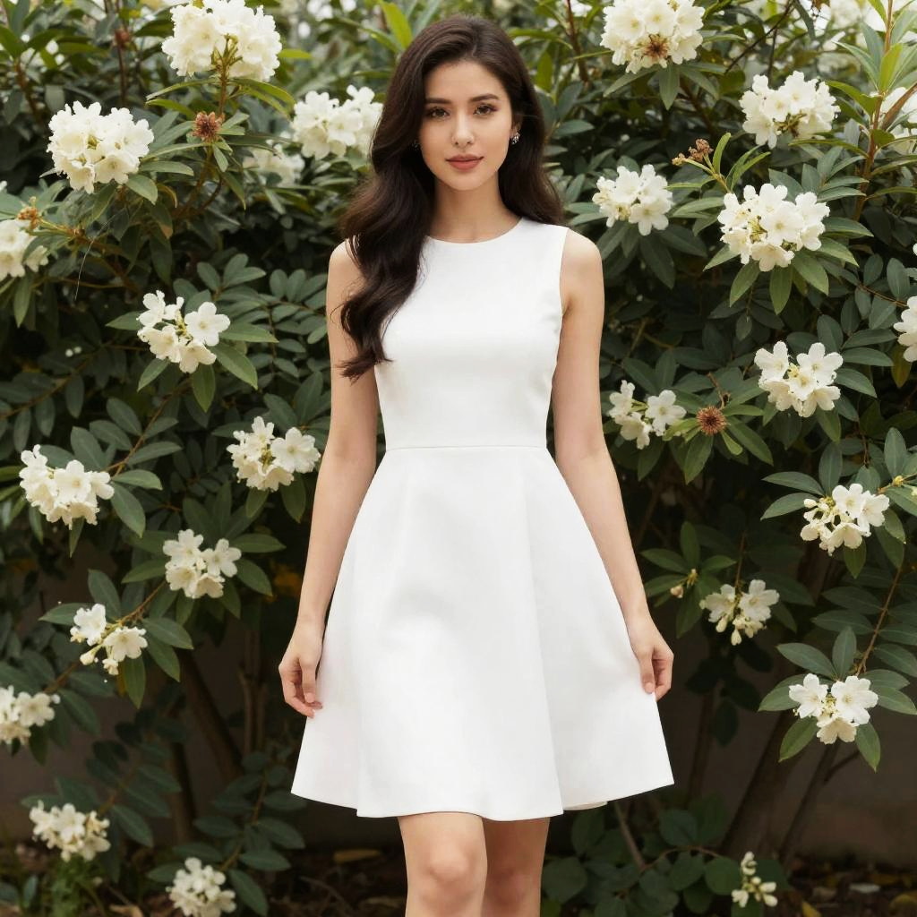 A young woman stands confidently amidst lush greenery and white flowers, wearing a stylish sleeveless white dress with a flared skirt. The elegant and minimalistic outfit paired with her soft waves and natural makeup reflects a modern, fresh aesthetic perfect for spring or summer fashion shoots.