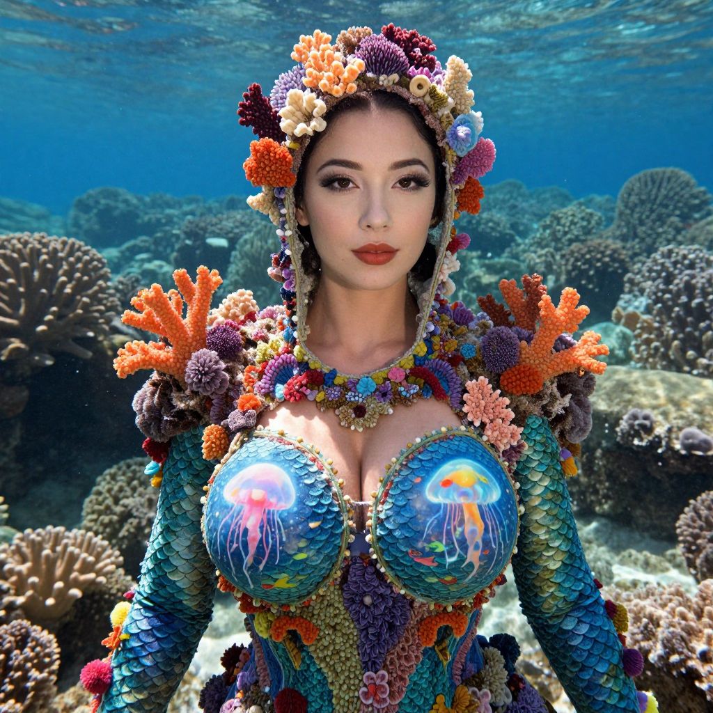 A woman dressed in an elaborate, ocean-themed costume stands underwater surrounded by coral reefs. Her outfit features detailed aquatic elements, including vibrant coral decorations and jellyfish motifs on her chest piece, creating a stunning underwater fantasy look.