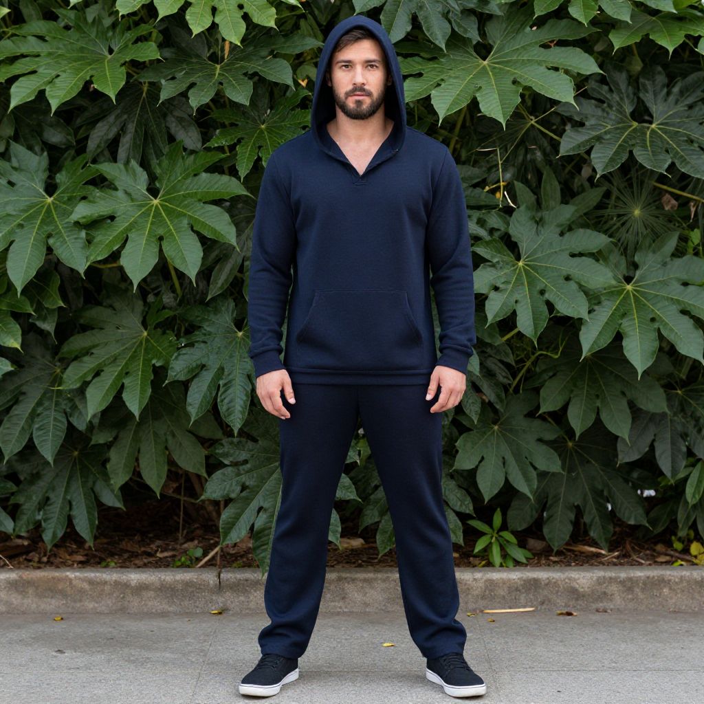 A man stands confidently against a backdrop of lush green foliage, wearing a matching navy blue hoodie and sweatpants set paired with black sneakers. The casual outfit and natural setting evoke a relaxed and sporty vibe.
