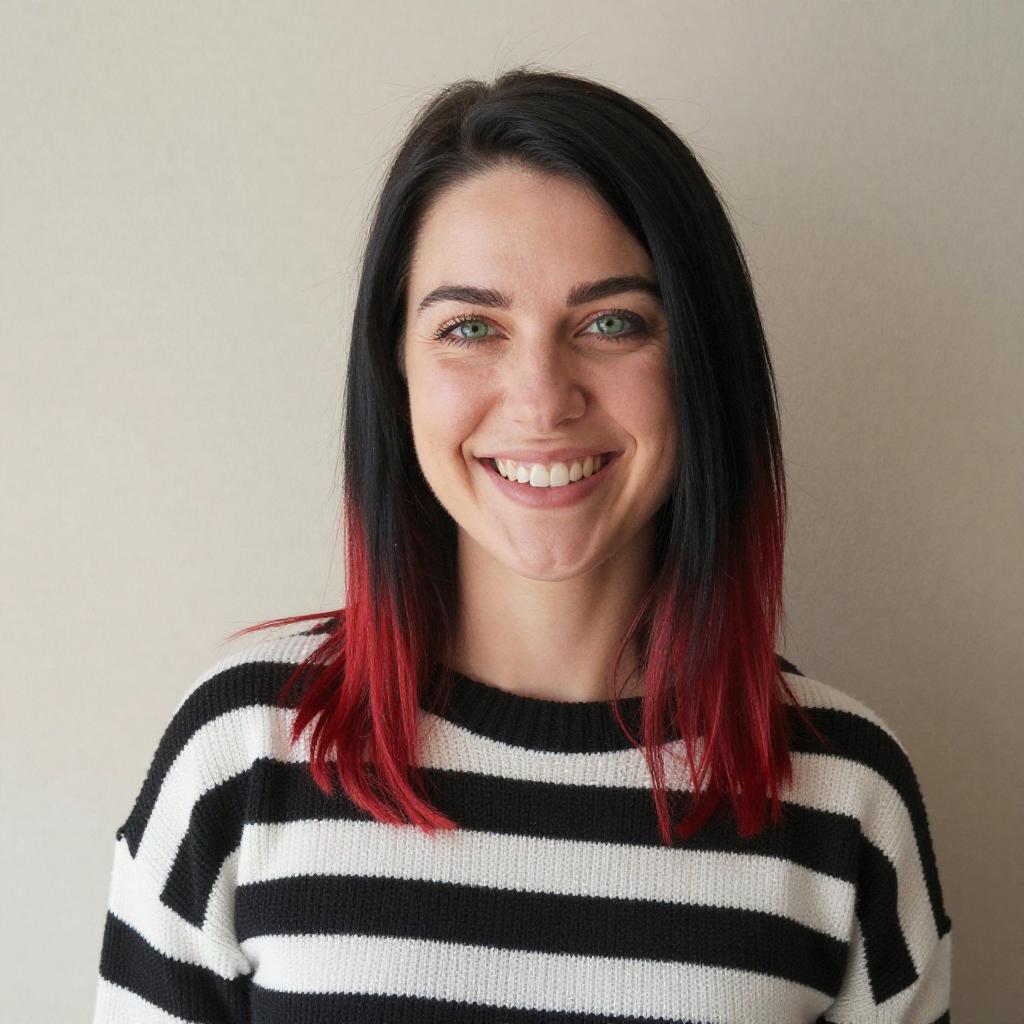 A cheerful young woman with striking green eyes and black hair dyed red at the tips smiles warmly at the camera. She is wearing a cozy black and white striped sweater and stands against a neutral background, exuding a vibrant and friendly energy typical of Gen Z style.