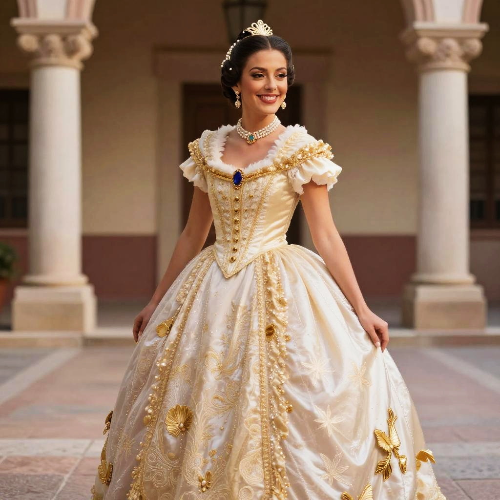 A woman poses gracefully in an elegant ivory and gold ball gown reminiscent of a classic fairytale princess costume. The dress features intricate embroidery and embellishments, complemented by a pearl choker necklace and a delicate tiara, evoking a regal and timeless style.