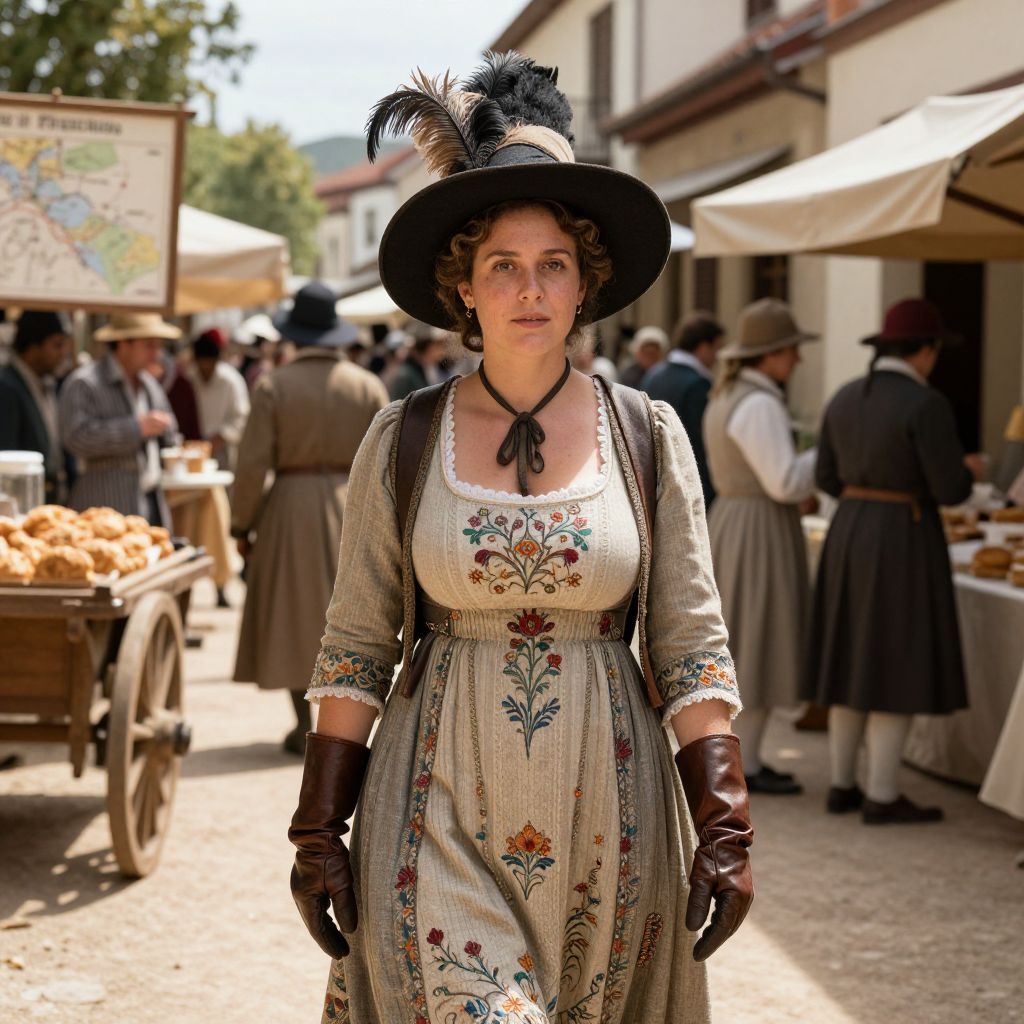 Woman in 18th Century Embroidered Dress and Feathered Hat at Historical Market