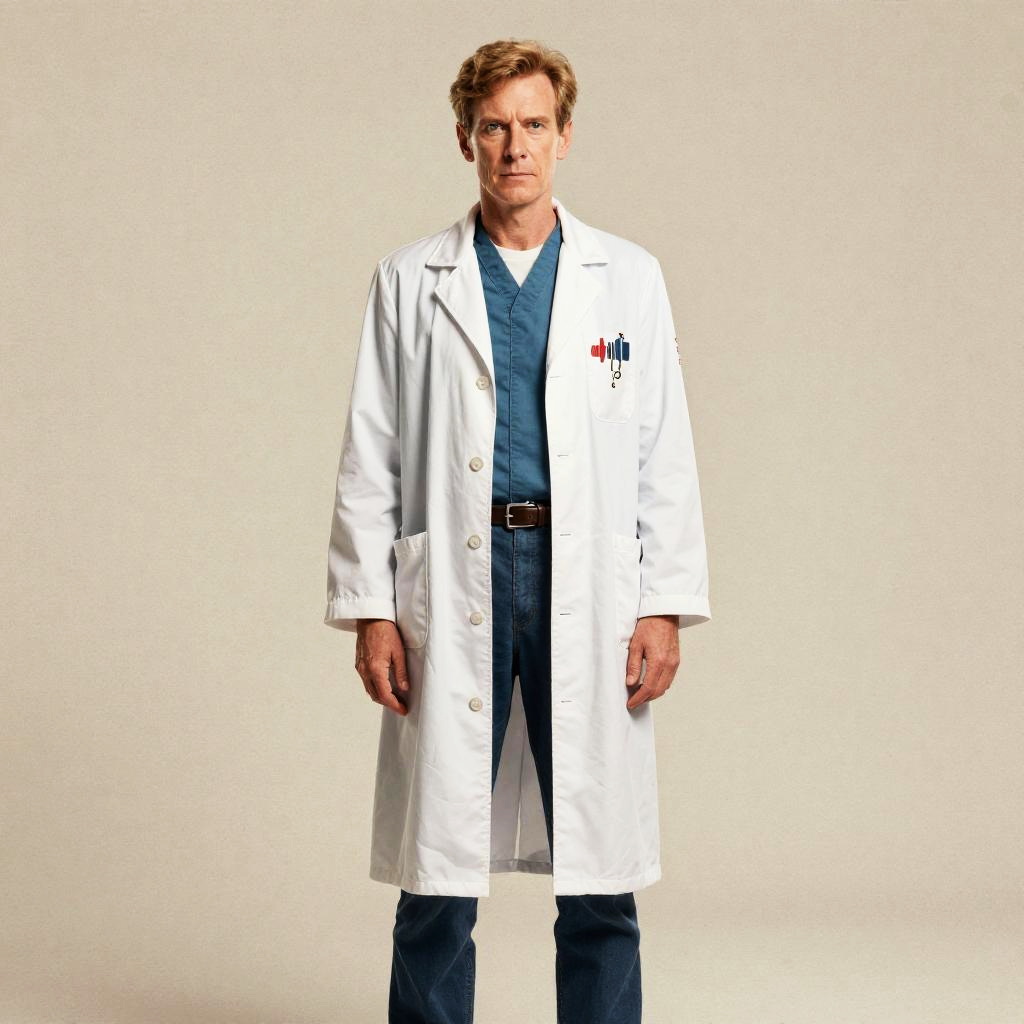 A serious middle-aged man stands confidently wearing a white lab coat over blue medical scrubs, presenting a professional and focused demeanor typical of healthcare workers. The plain beige background highlights the subject, giving a clean and clinical aesthetic to the portrait.