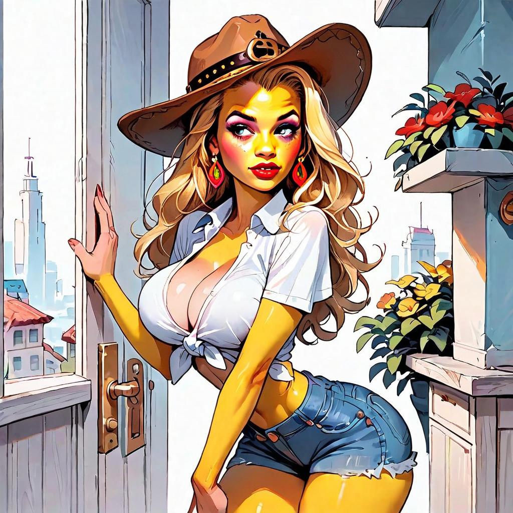 Stylish Blonde Woman in Western Hat and Denim Shorts Comic Art