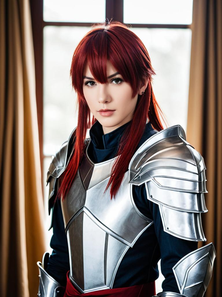 A striking cosplay portrait of a woman dressed as Argent from Honkai Star Rail, featuring detailed silver armor and vibrant red hair styled in a fantasy-inspired look. The image blends realistic photography with elements of video game costume design, capturing the intense and heroic aura of the character.