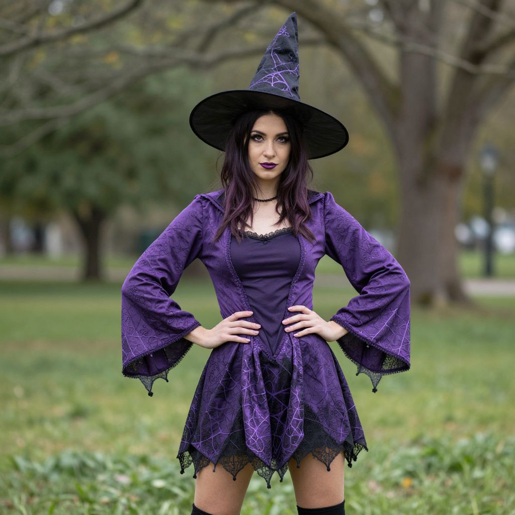 A confident woman dressed in a stylish purple witch costume stands outdoors with her hands on her hips. The outfit features a pointed hat and a dress adorned with spiderweb patterns and lace, perfect for a Halloween or fantasy-themed event.