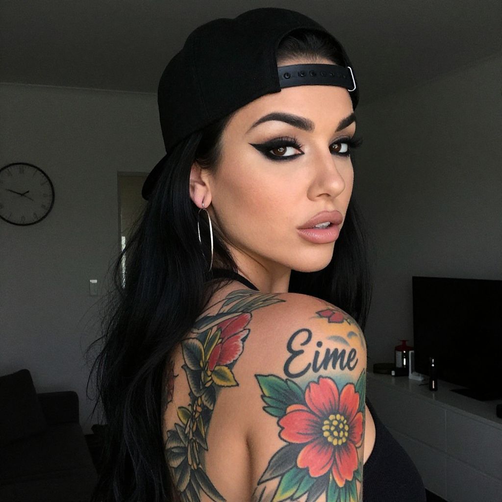 A striking portrait of a woman with long black hair wearing a backward black cap and hoop earrings, showcasing bold winged eyeliner and natural makeup. Her shoulder is adorned with vibrant floral tattoos featuring red and green hues with the word 'Eime' inked above. The indoor setting has a modern, minimalist vibe with neutral tones in the background.