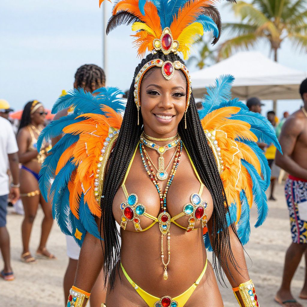 A smiling woman enjoys a vibrant carnival celebration wearing an elaborate costume adorned with blue and orange feathers, sparkling jewels, and intricate beadwork. The festive beach setting highlights the joyous atmosphere of the event with colorful costumes and lively participants in the background.
