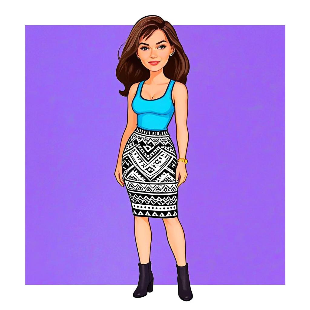 This vibrant digital illustration features a stylish woman with flowing brown hair and a confident expression. She is dressed in a casual chic aqua blue tank top paired with a black and white geometric patterned skirt, complemented by black ankle boots and a gold watch, set against a bold purple background.