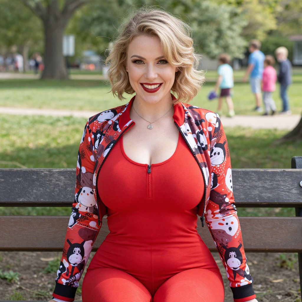A cheerful woman with blonde hair and bright red lipstick sits on a park bench, wearing a vibrant red jumpsuit paired with a playful, cartoon-patterned zip-up jacket. The lively outdoor setting features greenery and blurred figures of children playing in the background, capturing a joyful and relaxed atmosphere.