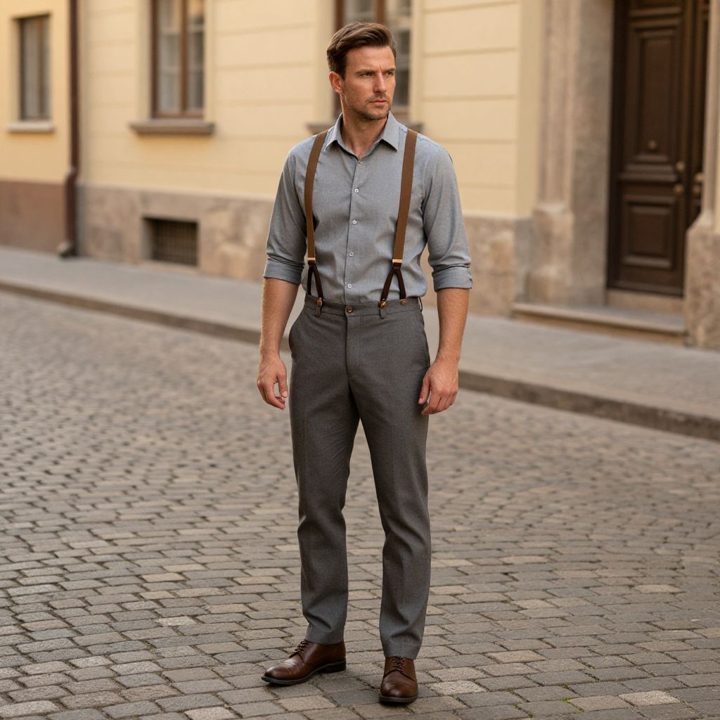 A man stands confidently on a cobblestone street wearing a gray dress shirt paired with gray trousers and brown suspenders. His look is complemented by brown leather shoes, evoking a classic vintage style in an urban setting with historic architecture in the background.