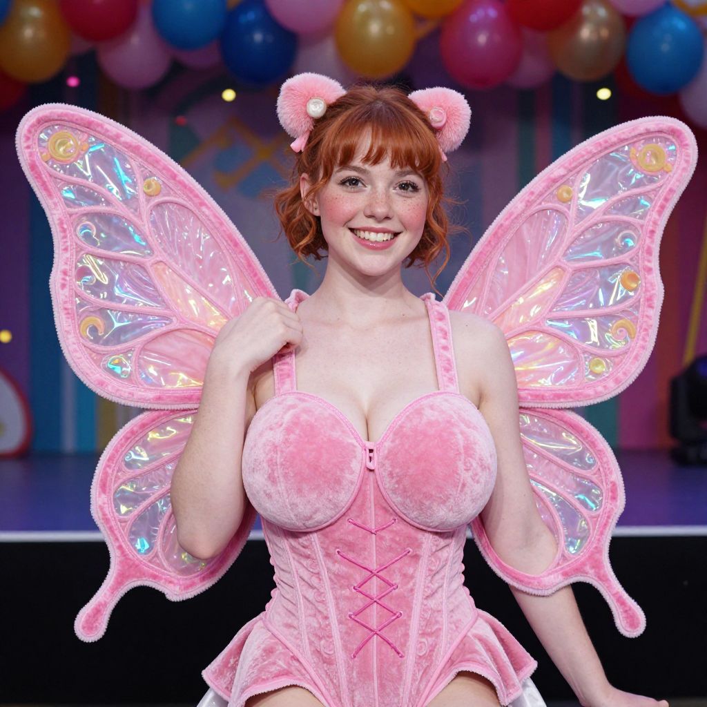 A smiling young woman dressed in a playful pink fairy costume featuring iridescent butterfly wings and a matching velvet corset. She accessorizes with fluffy pink ear headbands, standing in a colorful setting with balloons in the background, evoking a whimsical and festive atmosphere.