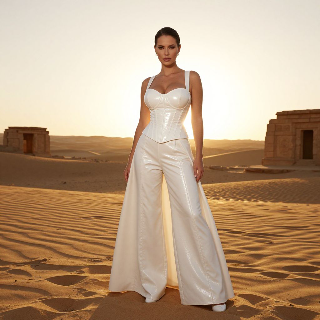A confident woman stands in a desert landscape at sunset, wearing a stylish white corset top paired with wide-legged pants made from a shiny material. The warm golden light highlights both her outfit and the ancient stone structures in the background, creating a striking contrast between modern fashion and historical surroundings.