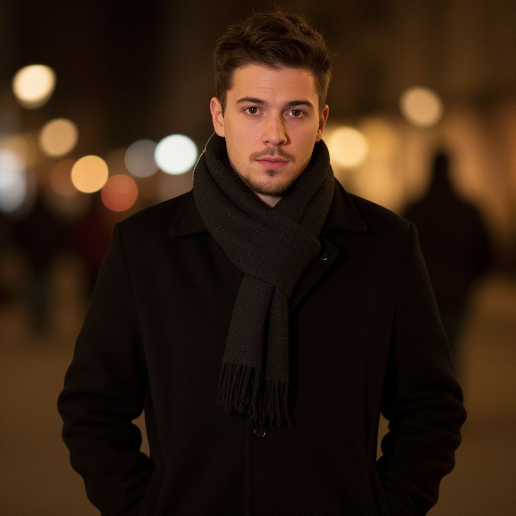 Young Man Wearing Black Coat and Scarf in Nighttime Bokeh Light Setting