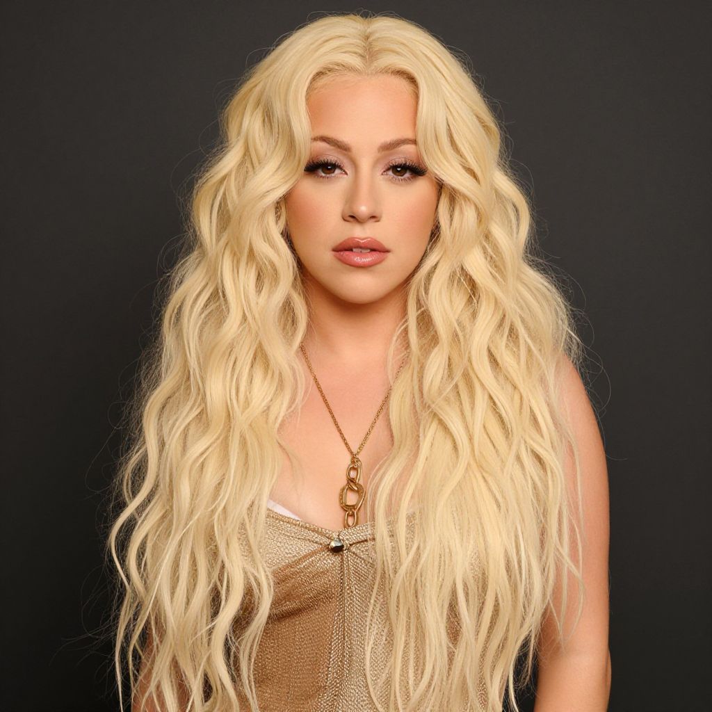 A portrait of a woman with long, wavy platinum blonde hair wearing a beige top and a gold chain necklace. The image features soft lighting against a dark background, emphasizing her flawless makeup and serene expression.