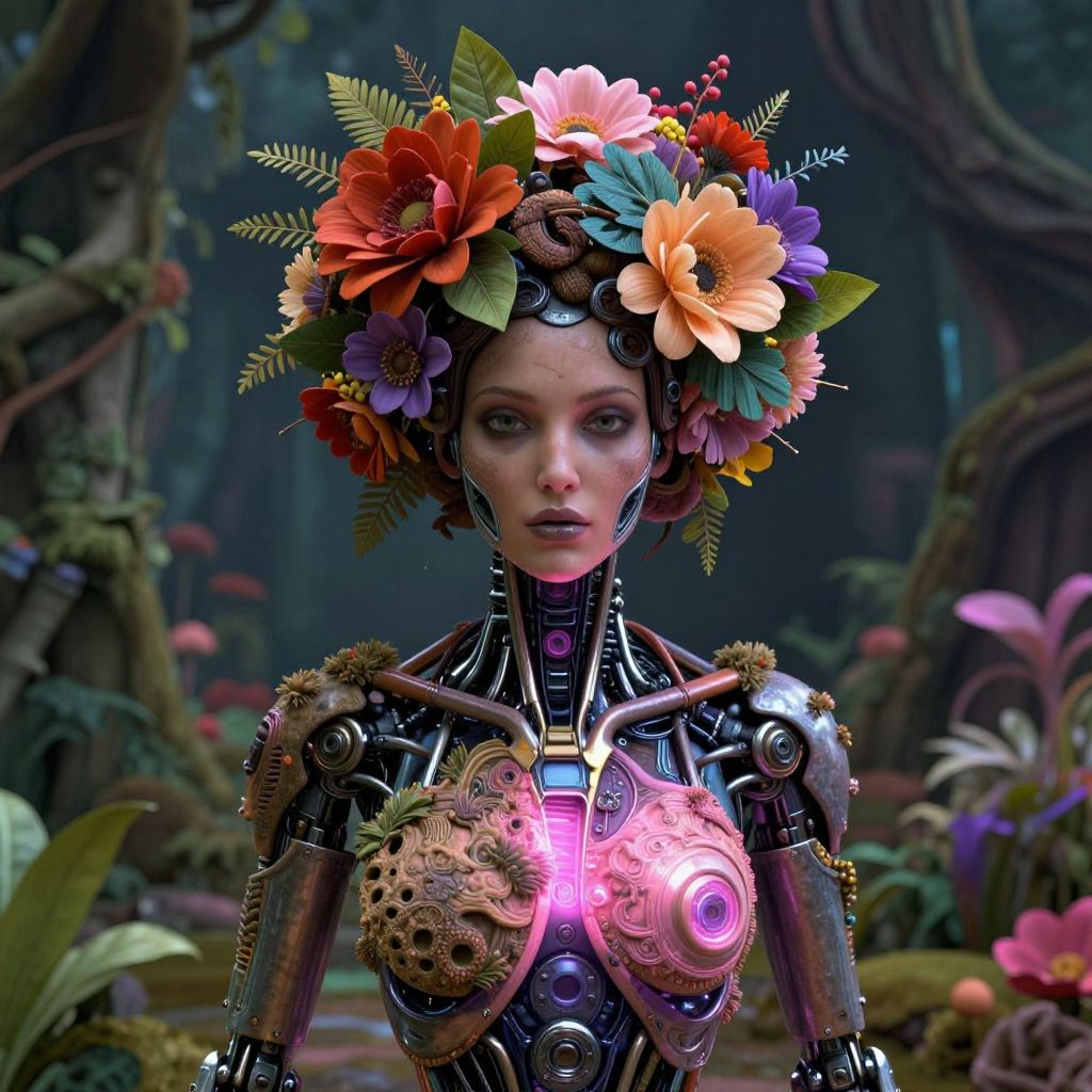 A futuristic female cyborg adorned with a vibrant crown of oversized flowers stands in a lush, otherworldly forest. The intricate blend of mechanical components and organic floral elements creates a striking contrast, highlighting a fusion of nature and advanced technology in a surreal sci-fi style.