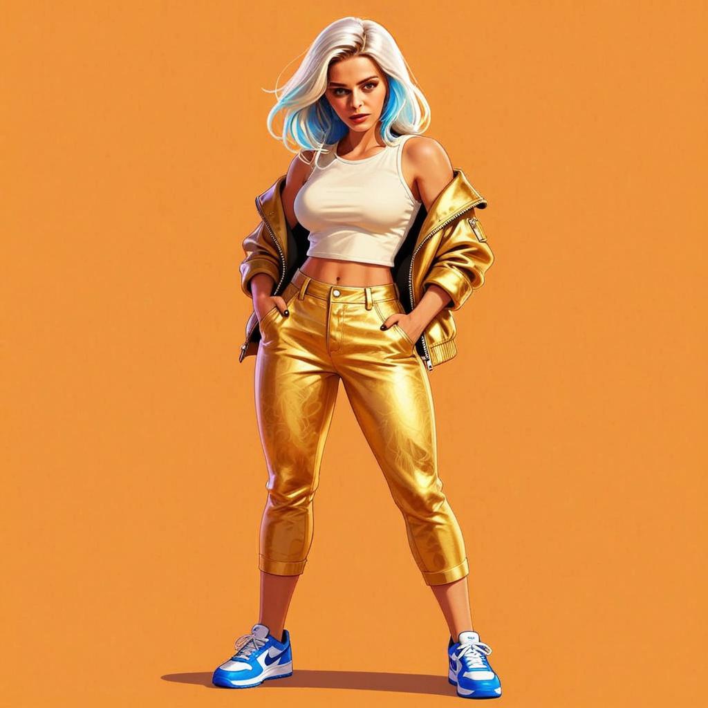 A confident woman with platinum blonde hair and blue highlights stands against a solid orange background. She is styled in shiny golden pants, a matching gold jacket draped off her shoulders, a white crop top, and blue and white sneakers, embodying a modern, urban fashion aesthetic with a touch of streetwear influence.