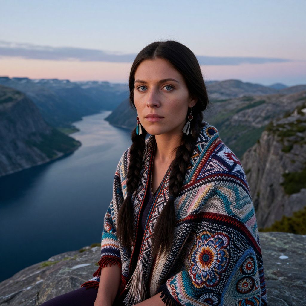 A woman with braided hair wrapped in a colorful, patterned shawl sits on a rocky cliff overlooking a serene fjord at dusk. The soft natural light highlights her calm expression as the river winds through the mountainous landscape in the background.