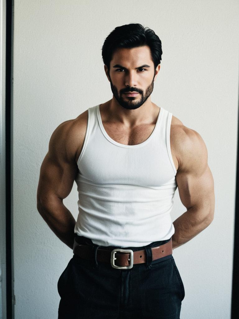 A muscular man confidently poses indoors wearing a white ribbed tank top and dark trousers with a brown belt. The clean background emphasizes his strong physique and intense gaze, showcasing a modern, minimalist portrait style.