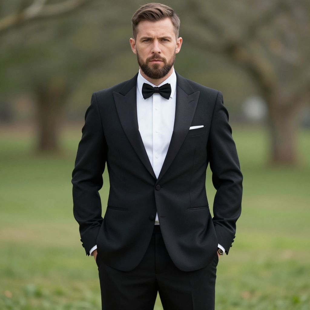 A confident man stands outdoors wearing a classic black tuxedo with a white dress shirt and black bow tie. His well-groomed beard and neat hairstyle complement the formal and elegant look against a blurred natural background.