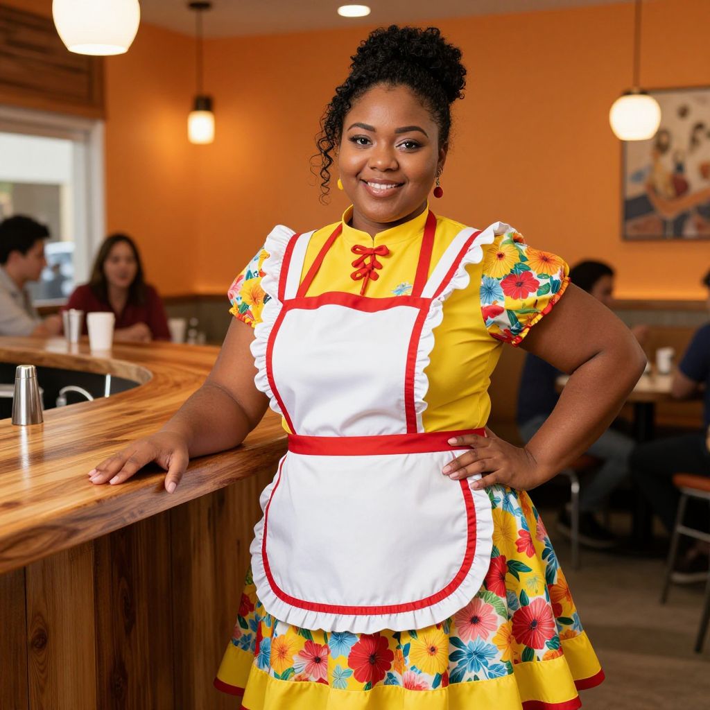 Woman in Traditional Floral Dress with Apron in Cozy Cafe