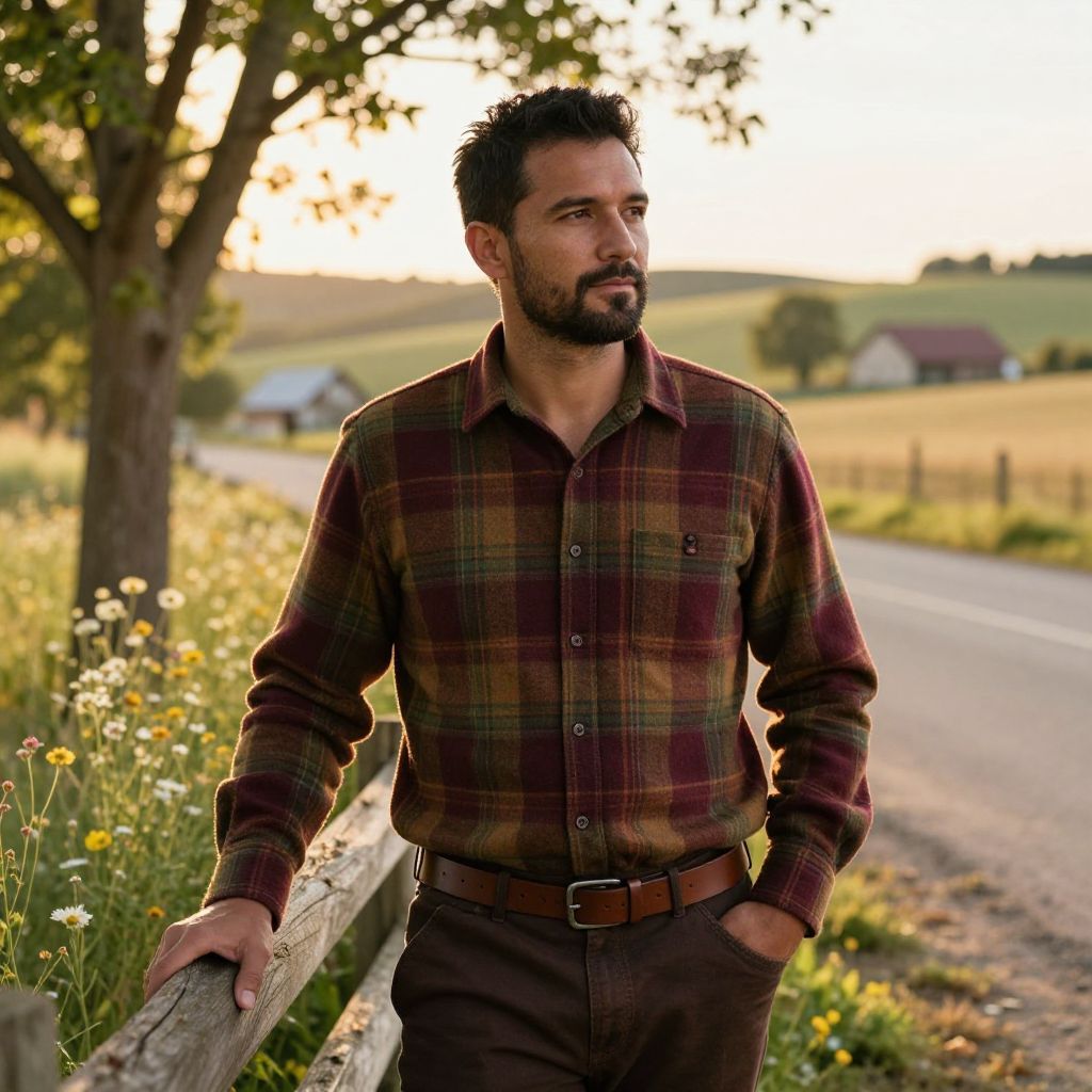 A man in a plaid flannel shirt stands thoughtfully by a wooden fence along a country road during golden hour. The rural backdrop features wildflowers, trees, and distant farmhouses, creating a serene and rustic atmosphere.