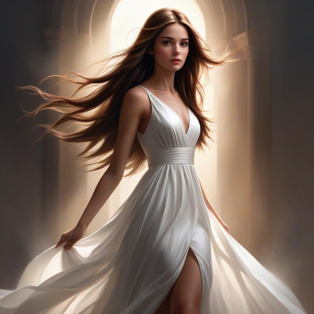 This captivating image features a woman with flowing, ethereal hair that seems to dance in the air, creating a dreamy and mystical atmosphere. The soft focus and subtle color palette enhance the beauty of the subject, evoking a sense of serenity and grace.