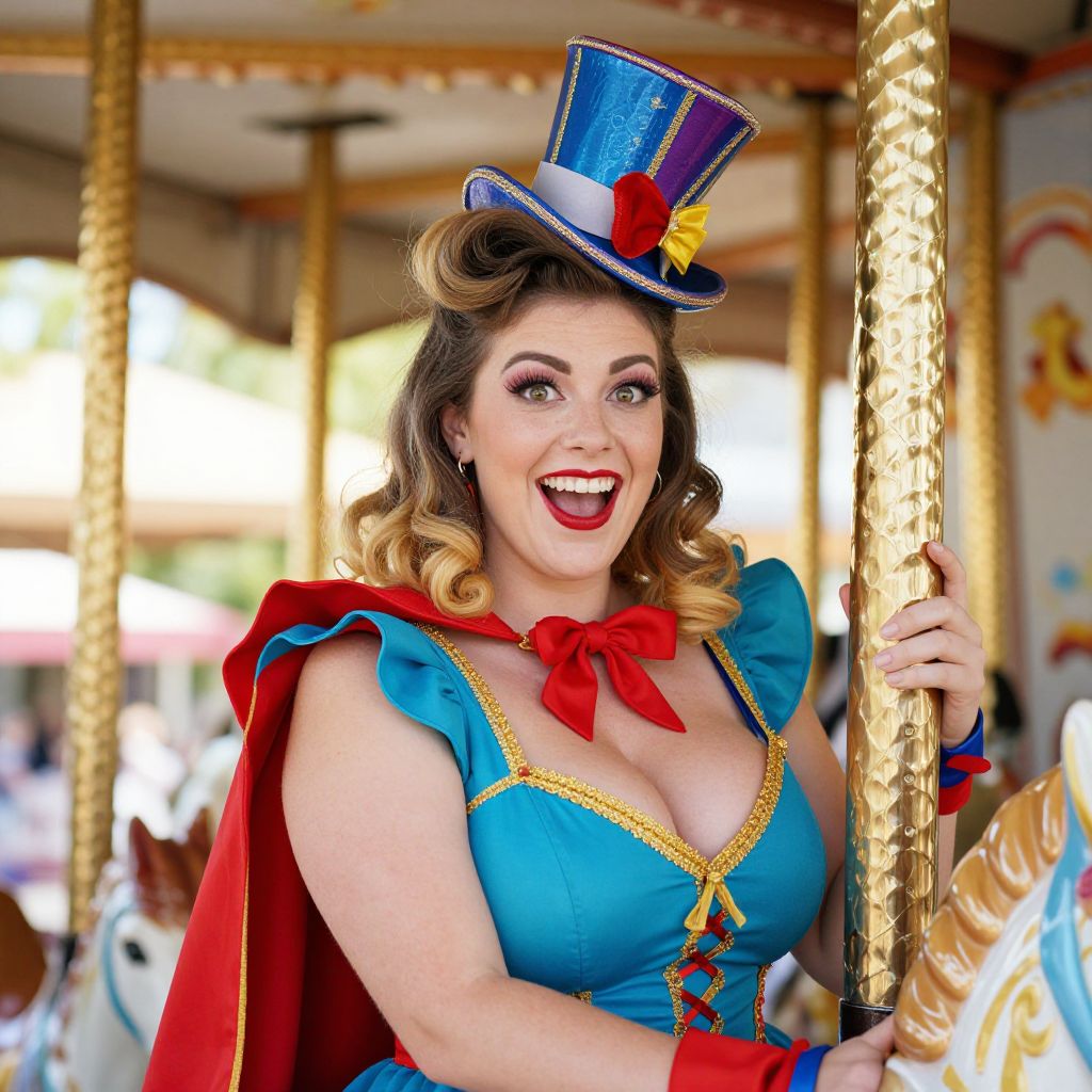 A joyful woman dressed in a vibrant blue and red costume with gold accents rides a carousel horse. She wears a festive top hat and a bright red cape, embodying a playful circus or carnival performer style with vintage pin-up makeup and retro curls.