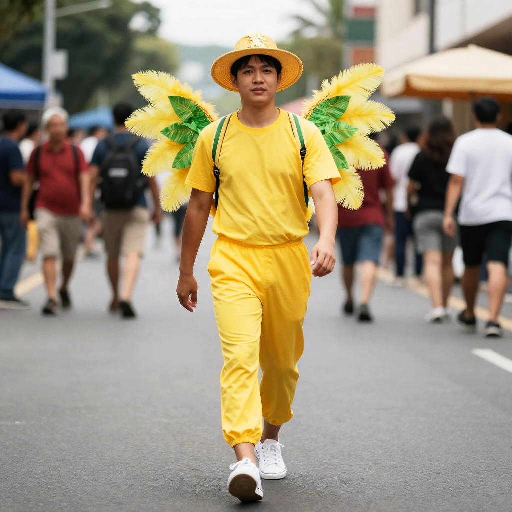 Man in Yellow Carnival Costume with Feathered Wings Walking on Street