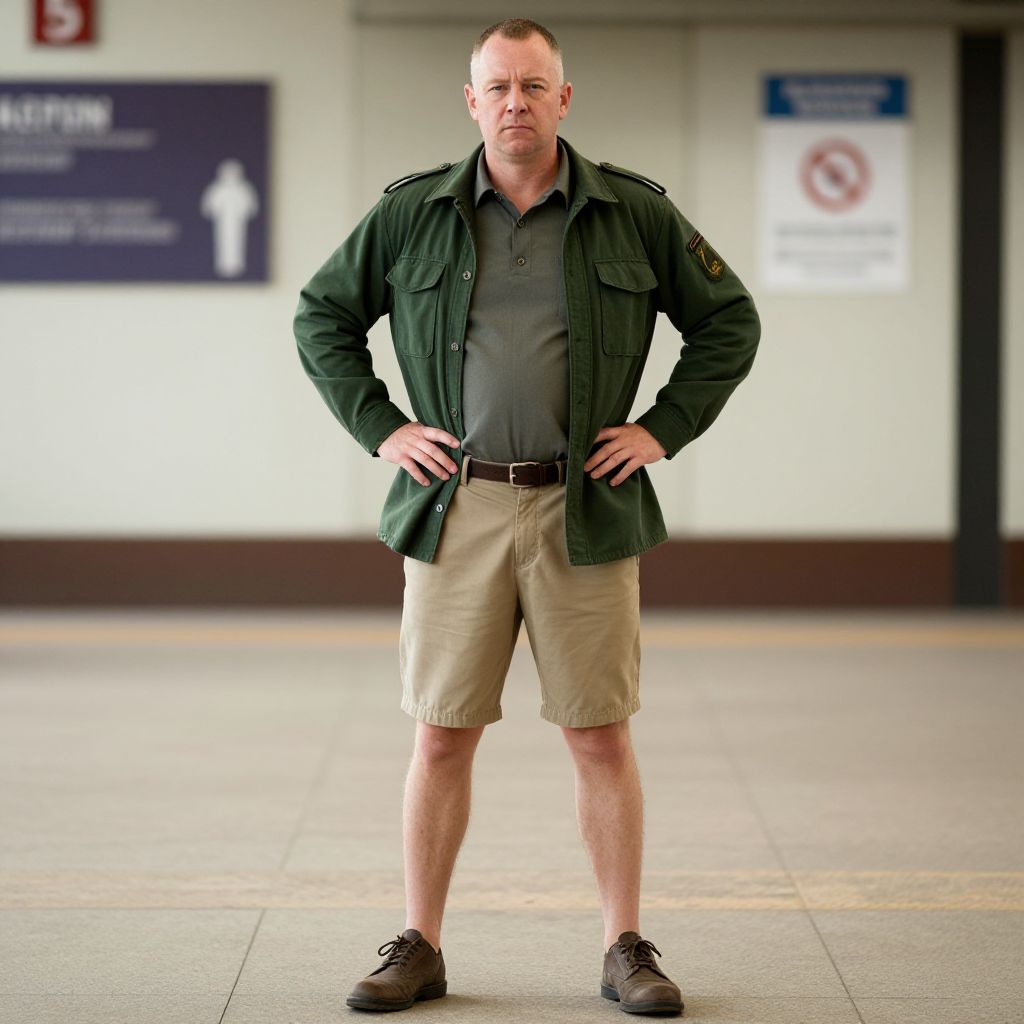 A man stands confidently with hands on hips in a casual outfit consisting of a green jacket, grey polo shirt, and beige shorts, set against a blurred indoor background with signage. His stance and expression convey determination and assertiveness in this candid portrait.