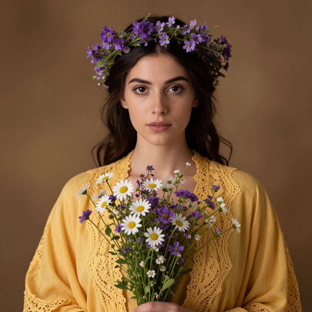 A young woman with long dark hair wears a purple flower crown and holds a vibrant bouquet of daisies and wildflowers against a warm, brown background. She is dressed in a mustard yellow embroidered garment, exuding a calm and natural beauty with a soft, earthy aesthetic.
