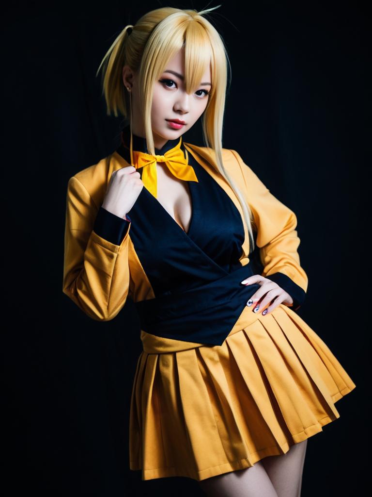 A woman dressed in a vibrant yellow and black cosplay costume inspired by Ougi Oshino from the Monogatari series poses confidently against a dark backdrop. The outfit features a pleated skirt, matching jacket, and a distinctive large bow tie, capturing the character's iconic style with realistic detail.