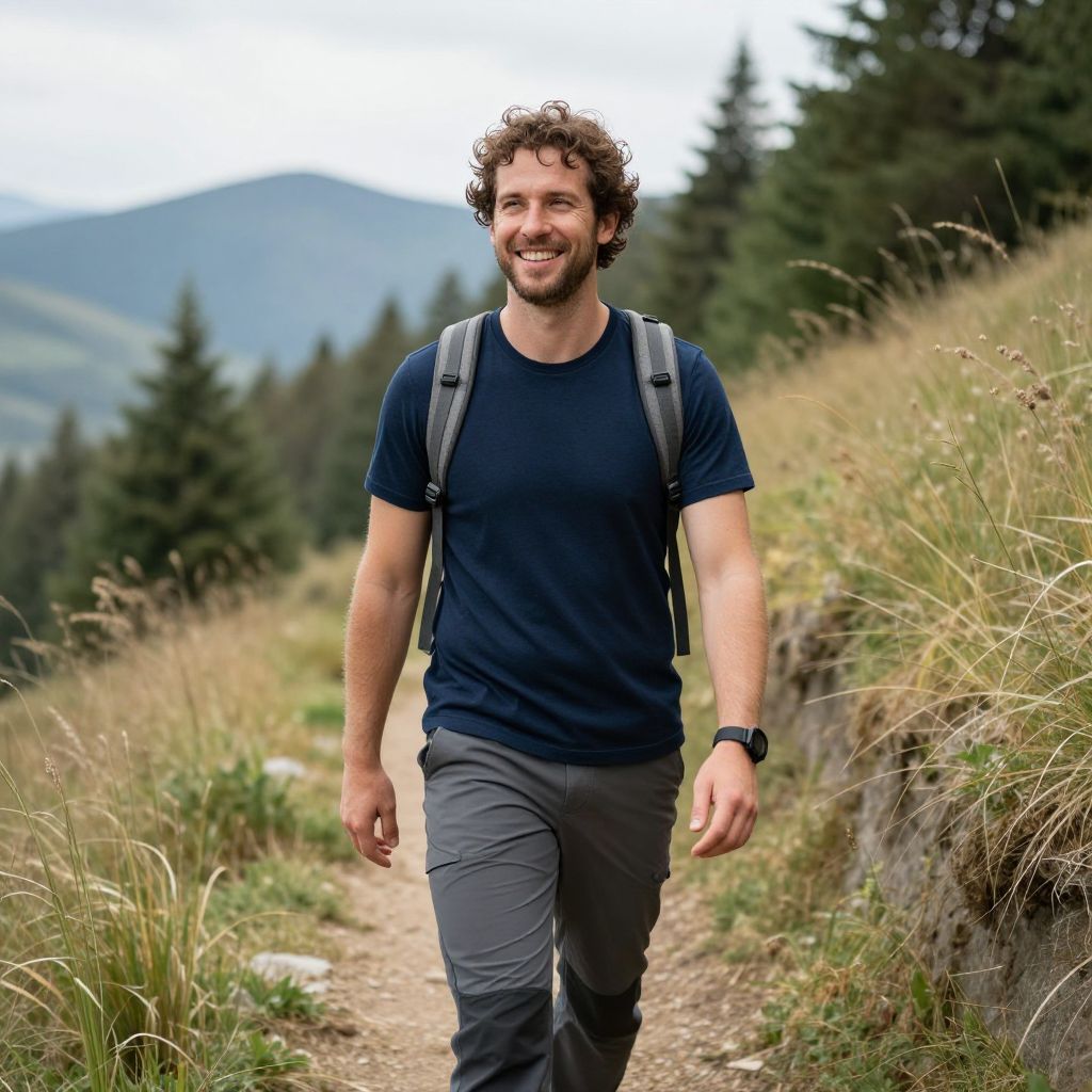 A smiling man with curly hair is hiking along a mountain trail surrounded by greenery and pine trees. He is dressed in a navy blue t-shirt and gray pants, carrying a gray backpack and wearing a smartwatch, enjoying an outdoor adventure in a natural landscape.